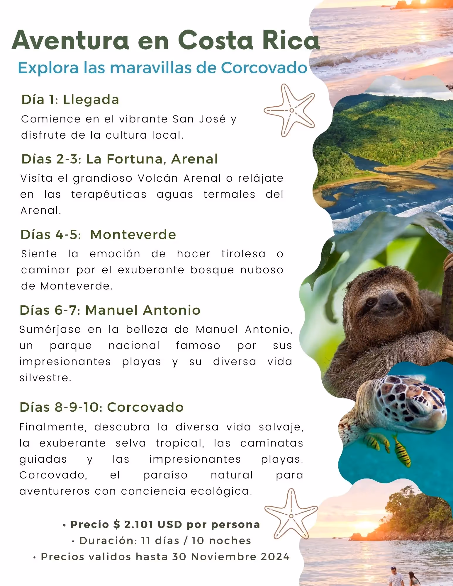 Entendemos que cada viajero es único. Ofrecemos una variedad de opciones de viaje, que van desde 7 días hasta 12 días o más, dependiendo de su disponibilidad y preferencias. También adaptado a su presupuesto para brindarle experiencias inolvidables de su viaje por Costa Rica y crear recuerdos que durarán toda la vida.